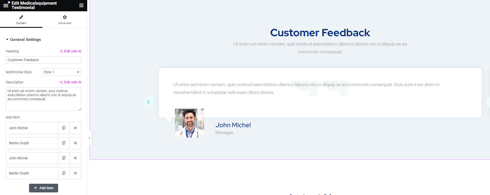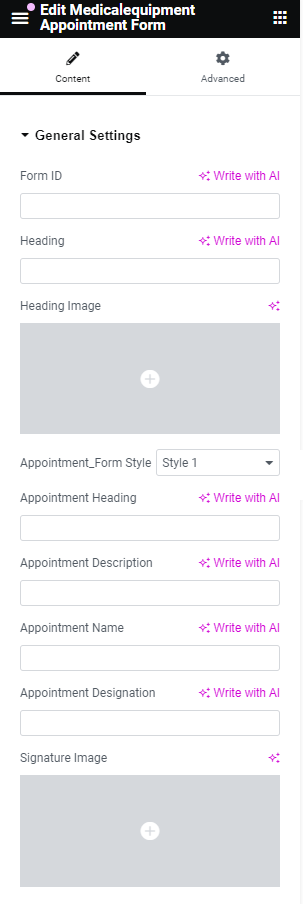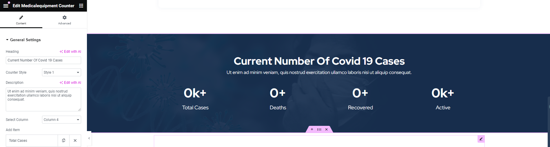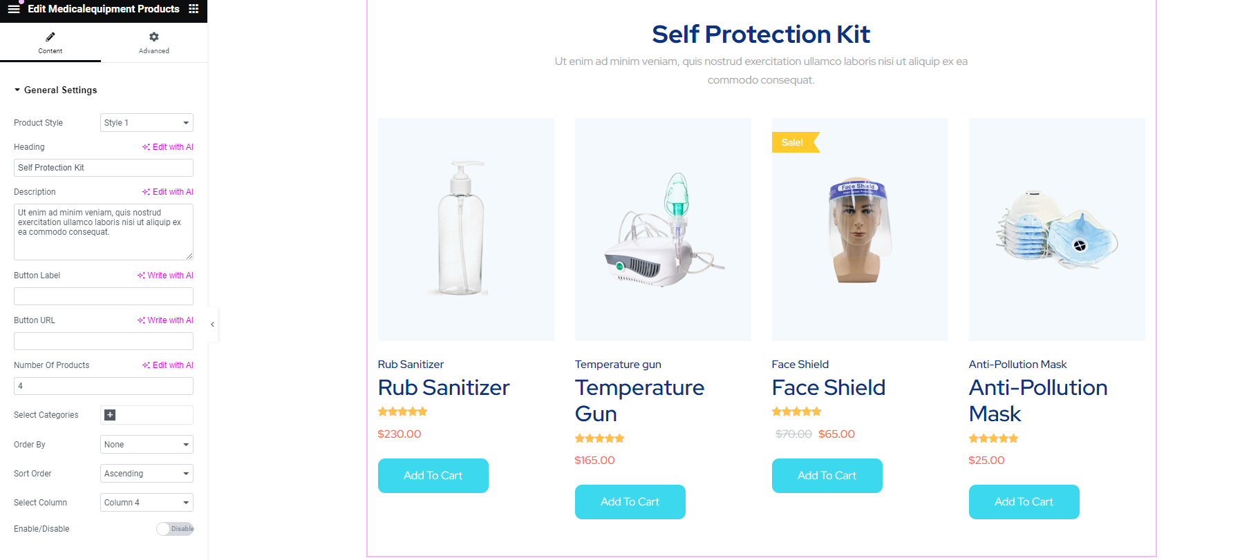 After adding title of the page click on Edit with Elementor button, you will get custom built shortcodes under MedicalEquipment Widget Section.