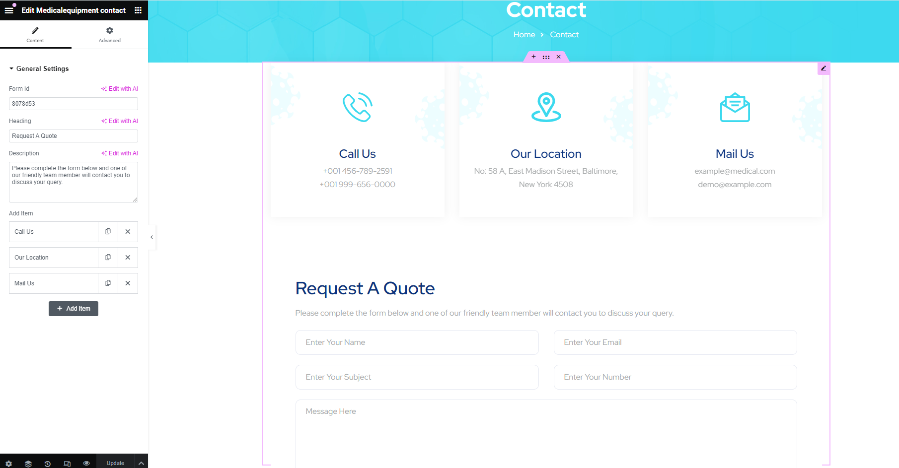 With this shortcode, you can show the contact form along with other contact items.