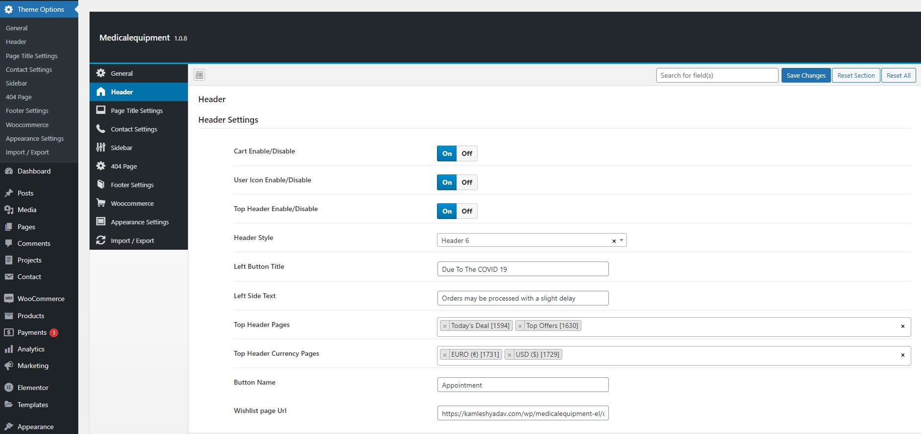 Header settings consist of header style, top header settings, add to cart and user icon enable/disable option.
