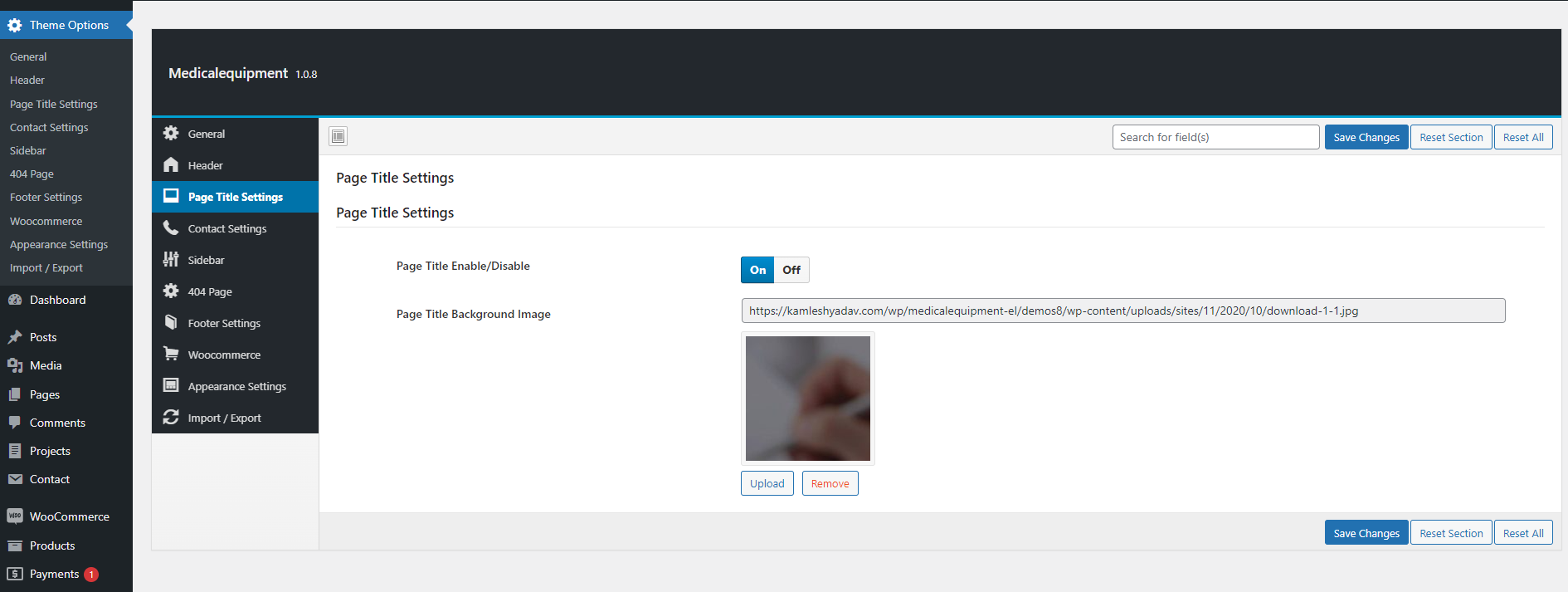 Page Title settings consist of page_title enable/disable option and upload page title image.