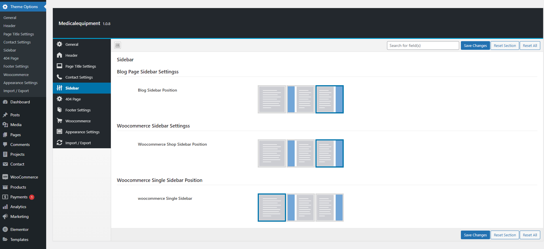 Sidebar settings consist of Blog Page, Woocommerce Shop and Single sidebar position.
