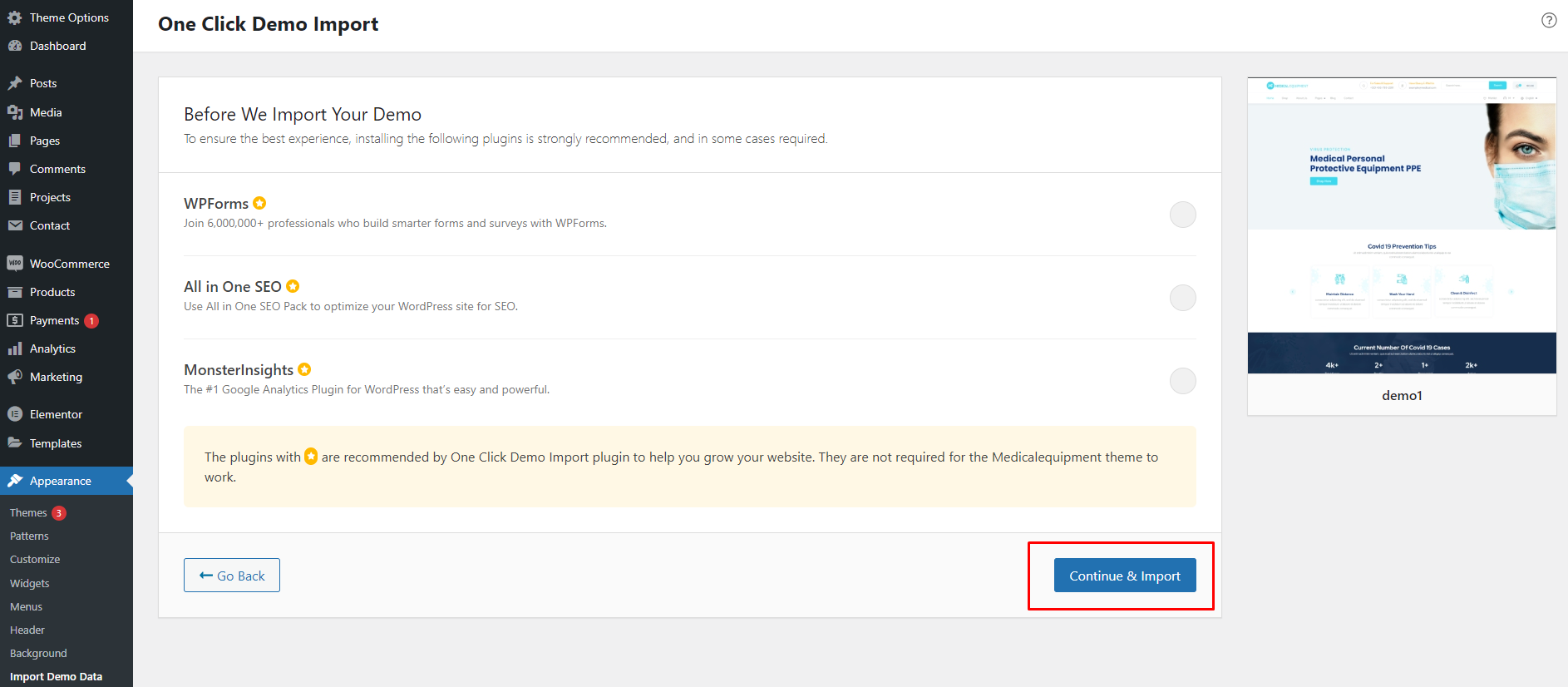 Step 8 - Now, click on Continue & Import button. And wait till demo gets imported.